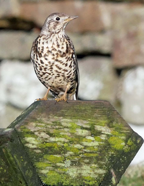 Mistle thrushes tend to be wary birds, hard to approach closely. I photographed this one a couple of weeks ago at Stanhope in Weardale, managing to get within camera range because it was guarding a holly bush that was still loaded with berries. When they find a food source like this they'll defend it against all other thrushes and this one was reluctant to leave, even though it was clearly uncomfortable with my presence. I took a few pictures then left it to chase away a sneaky blackbird that had tried to plunder a few of the berries while the thrush's back was turned.